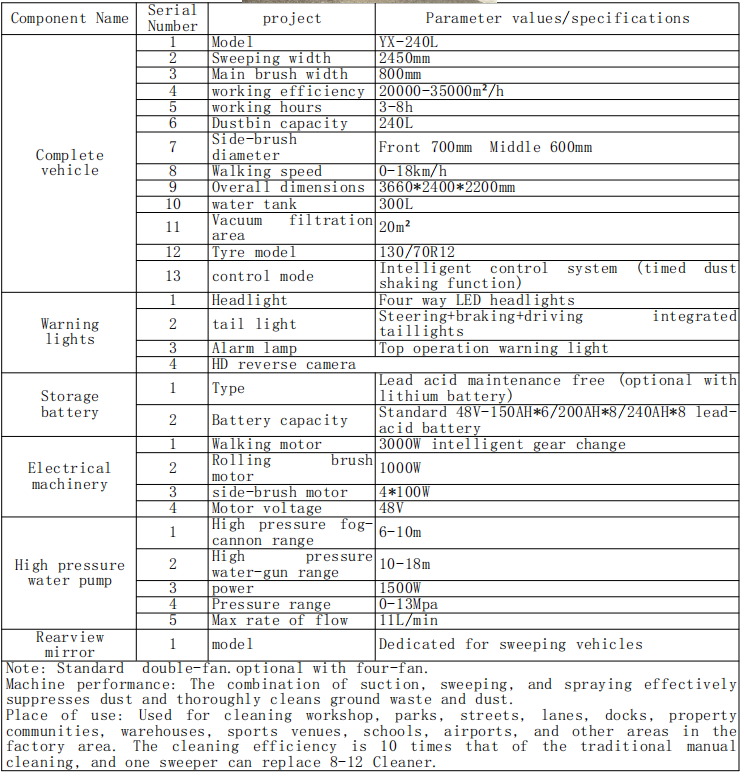 Τόπος χρήσης: Χρησιμοποιείται για τον καθαρισμό του εργαστηρίου, των πάρκων, των δρόμων, των λωρίδων, των αποβάθρων, των ακινήτων, των αποθηκών, των αθλητικών χώρων, των σχολείων, των αεροδρομίων και άλλων περιοχών της περιοχής. Η απόδοση καθαρισμού είναι 10 φορές εκείνη του παραδοσιακού χειροκίνητου και ένας σαρωτής μπορεί να αντικαταστήσει το καθαριστικό 8-12.