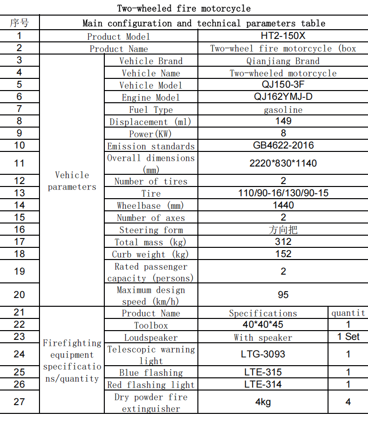 Η μοτοσικλέτα πυρόσβεσης όλων των εδάφους έχει εξαιρετική απόδοση εκτός δρόμου. Μπορεί γρήγορα και ευέλικτα να πραγματοποιήσει πυρόσβεση και διάσωση σε τραχιά ορεινά δρόμους ή στενά δρομάκια. Σε περίπτωση ξαφνικής πυρκαγιάς, μπορεί να μεταφέρει 3 άτομα για να σχηματίσει μια ομάδα μάχης για να σβήσει την πηγή πυρκαγιάς.